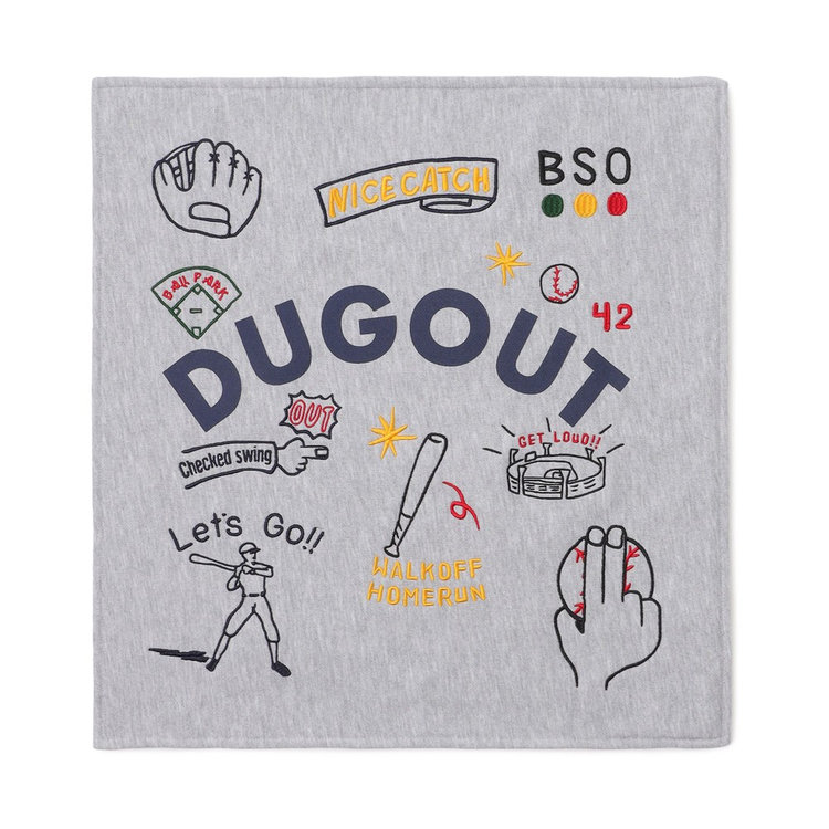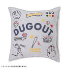 DUGOUTのプリントと,野球に関連するデザインが刺繍されたクッションカバーです。